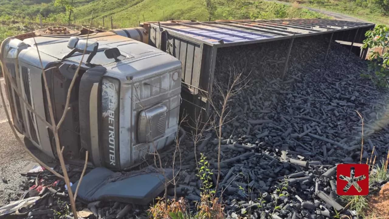 Carreta de carvão vegetal tomba na BR 351